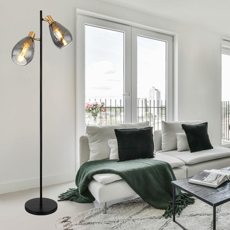 Descrizione Questa semplice lampada da terra colpisce per il suo bellissimo design. Da una base rotonda su cui si trovano due prese E27, ciascuna con un elegante paralume in vetro nei colori fumé, sporge un'asta metallica lunga 1,6 m di colore nero. Le prese E27 consentono di determinare autonomamente il colore della luce e la luminosità fino a una potenza massima di 40 Watt. Puoi azionare facilmente questa lampada da terra utilizzando il pressostato ON/OFF. Le lampadine non sono comprese nella fornitura. Lampada dettagli • Tipo di lampada: lampada da terra • Materiale: metallo, vetro • Colore: nero, ottone, fumo • Interruttore a pedale • Classe di protezione: 2 • Grado di protezione: IP20 • Lunghezza x larghezza x altezza in cm: 34x25x160 • Prese: 2x E27 • Lampadine incluse: No • Potenza della lampada: massimo 2x 60 watt • Alimentazione: 230V, 50Hz