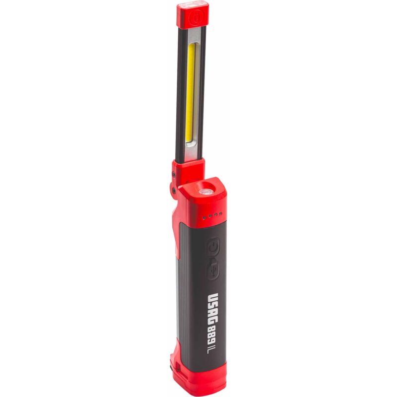 La Lampada LED Usag 889 IL Ideale per illuminare punti ristretti e con accesso limitato Corpo in materiale composito (parte nera alluminio, parte rossa polipropilene) La funzione torcia si attiva tenendo premuto per 2 secondi il tasto di accensione. È possibile attivarla sia da lampada spenta che da lampada accesa 3 modalità di illuminazione: testa, frontale, torcia Indicatore livello di batteria a 4 LED (i LED lampeggiano durante la carica) Snodata e orientabile a 180° Magnete all'estremità della luce da testa per recuperare piccole parti in metallo Base magnetica e morsetto a gancio Fornita con cavo USB-C SPECIFICHE TECNICHE Fonte di luce (funzione lampada) 1 x COB LED (3.1 W) Fonte di luce (testa) 1 x SMD LED (1.8 W) Fonte di luce (funzione torcia) 1 x SMD LED (0.5 W) Intensità di luce: lampada-testa-torcia (lux@0,5m) 420-2300-150 Flusso luminoso: lampada-testa-torcia (lm) 400-50-150 Indice resa cromatica lampada-testa-torcia (CRI) 80-80-70 Angolo di emissione luminosa