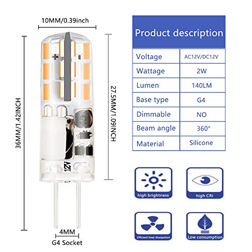 Lampada a LED G4, VINBE AC/DC 12V, 2W, corrisponde a lampade a incandescenza alogene da 20W, super luminosa, non dimmerabile, bianco caldo morbido (3000K, confezione da 10)