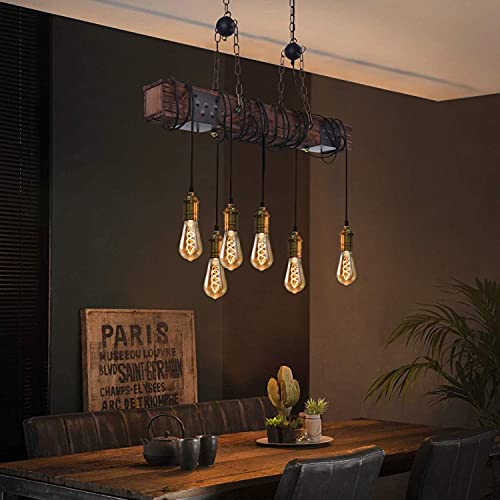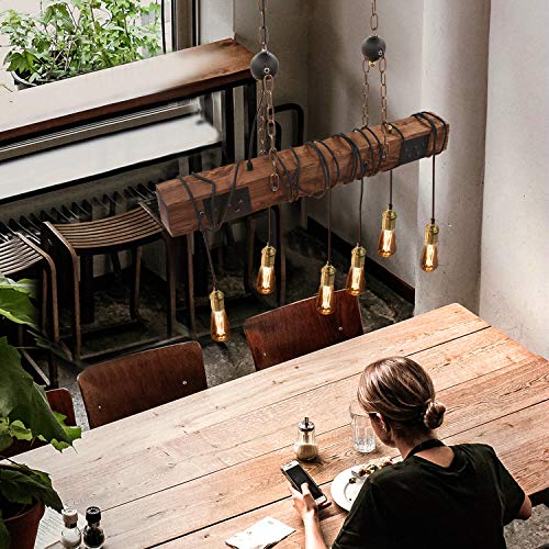 ZMH Lampadari a Sospensione Vintage Lampada Legno a soffitto - E27 6 Luci Nero Retro Regolabile Lampada da Tavolo da Pranzo 80CM in Industriale per cucina Salotto Camerette Bar(Lampadina non inclusa)