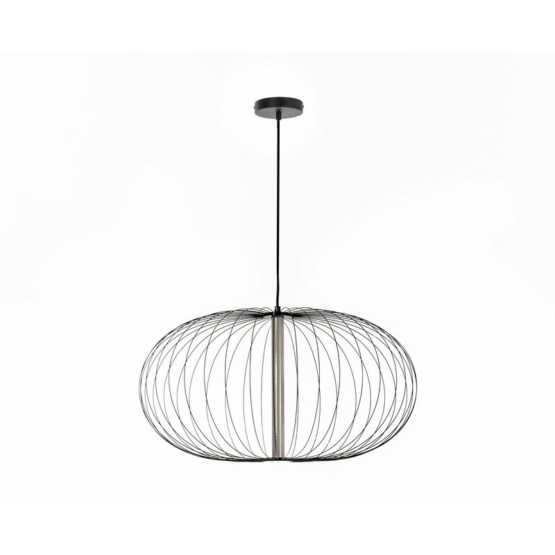 Lampadario led BEATRICE nero • paralume in fili di acciaio verniciato nero lucido • tubo in acrilico • luce LED 5W (3000 Kelvin) inclusa, classe energetica F • cavo con lunghezza regolabile in metallo telato colore nero • dimensioni cm. Ø.70 H.150