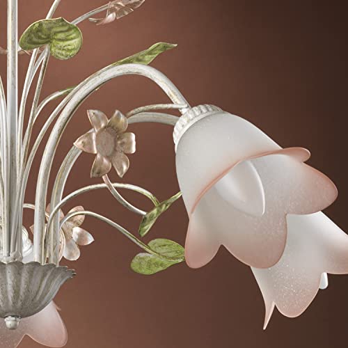I paralumi a forma di fiore in vetro bianco satinato presentano una sfumatura rosa sui petali che riprende il colore delle decorazioni.
