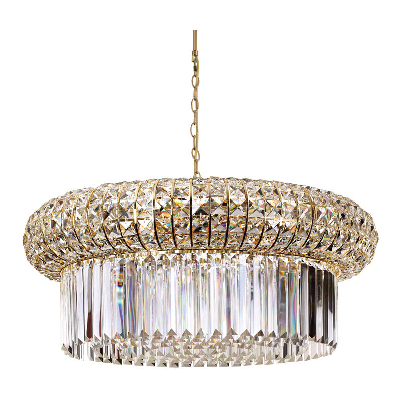 Collezione Nabucco L'ELEGANZA DEI PENDENTI Sospensione circolare 16 luci attacco piccolo E14. Montatura in metallo con finitura oro. Elementi decorativi in cristallo trasparente molato.. Quadrati nella parte superiore e a losanga in quella inferiore.