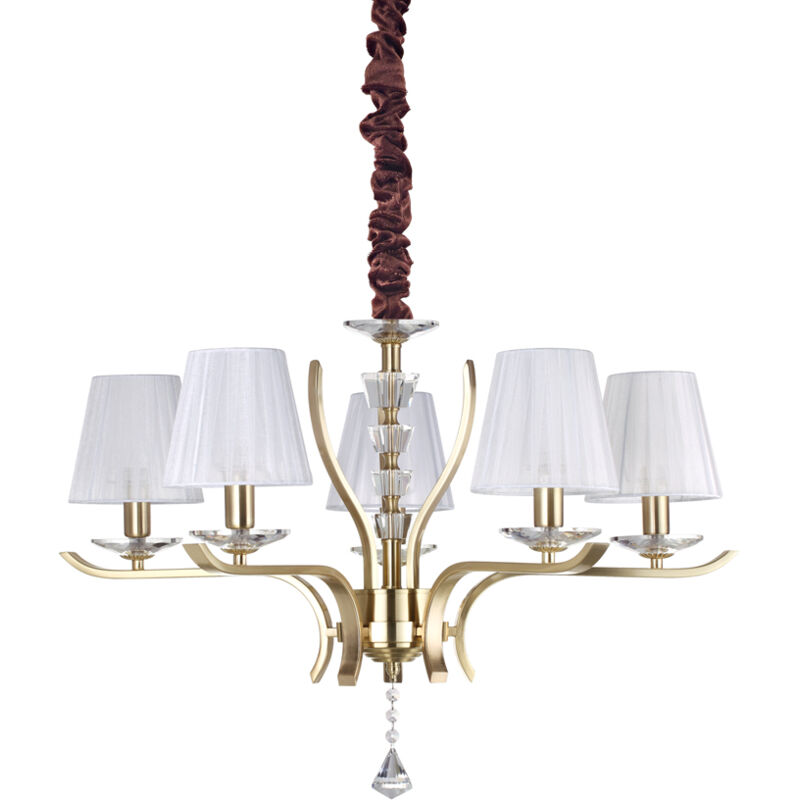 Collezione Pegaso COMPLEMENTI D'ARREDO PER ILLUMINARE CON ELEGANZA Lampadario diam.72 cm a 5 luci E14 max 40 W. Montatura in metallo ottone satinato. Corpo centrale, bobeches e pendagli in cristallo molato.. Paralumi in organza. Copricatena in velluto.