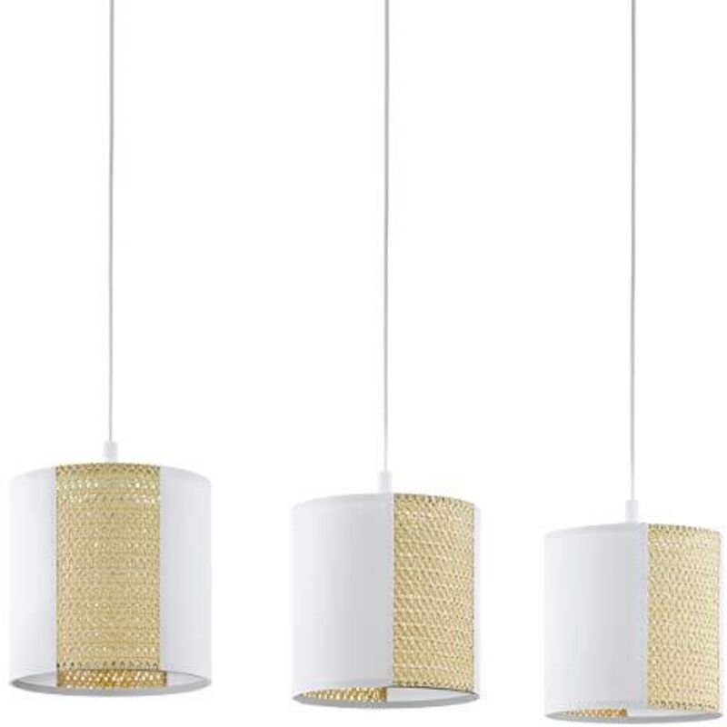 Collezione Arnhem LA LAMPADA DALLE TENDENDE NATURALISTICHE La lampada a sospensione ARNHEM è realizzata in metallo bianco con tre paralumi rotondi in carta kraft bianca e crine vegetale intrecciato dal colore naturale.. Gli elementi in carta e crine vegetale intrecciato, disposti in modo alternato, creano un gioco di luci e ombre quando la luce è accesa. Questa lampada a sospensione si armonizza perfettamente con tendenze quali nature, boho e hygge creando una piacevole atmosfera grazie ai suoi materiali naturali. Offre un'illuminazione moderna nel soggiorno o nella sala da pranzo, posizionata ad esempio al di sopra di un lungo tavolo da pranzo. Le lampadine non sono incluse nella consegna. Per la lampada è adatta qualsiasi lampadina con attacco E27.