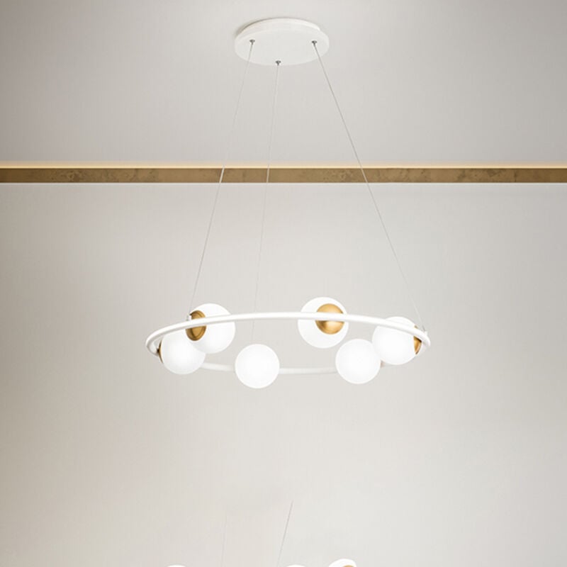 Collezione Ball LA LUCE CHE TI CONQUISTA La sospensione Perenz è un'elegante soluzione di illuminazione moderna, con una struttura in metallo bianco e 6 sfere di vetro bianco.. Questa plafoniera si adatta perfettamente a qualsiasi ambiente moderno, dall'ufficio alla zona living di casa. Le sfere di vetro bianco creano un effetto di luce diffusa, rendendo l'illuminazione calda ed accogliente. La sua forma sferica la rende un'ottima scelta per chi cerca un'illuminazione elegante e sofisticata.