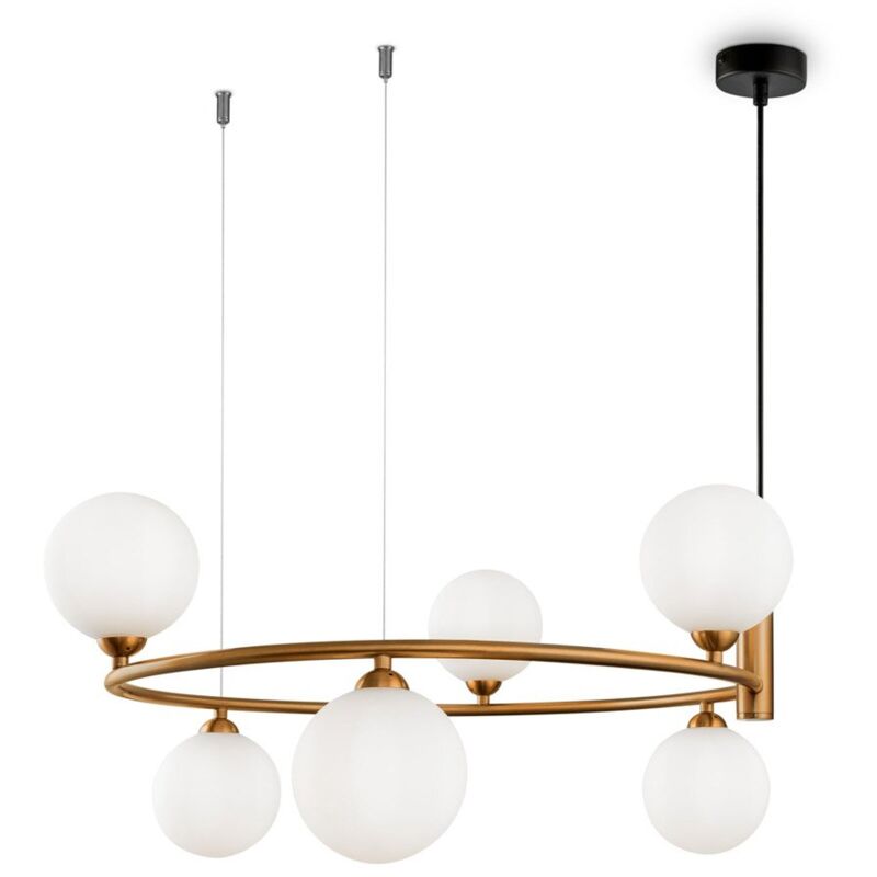 Collezione Ring LUCE E DESIGN IN PERFETTA ARMONIA Lampadario contemporaneo serie Ring con struttura arrotondata in metallo colore ottone, 6 luci con diffusori bianchi a forma di sfere in vetro soffiato.. È una lampada da soffitto dal design elegante e raffinato, che arreda con stile e personalità. I diffusori diffondono una luce morbida e avvolgente. L'altezza è regolabile, permettendo di adattare il lampadario alle proprie esigenze e preferenze. Il lampadario Ring è ideale per chi cerca una lampada da soffitto dal design moderno e ricercato, capace di creare un'atmosfera sofisticata e luminosa.