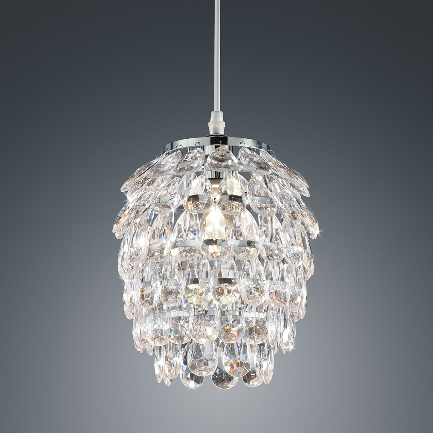 Il lampadario Petty conquista al primo sguardo con il suo scintillio glamour. L'elegante lampada è composta da pendenti in plastica scintillante in cui la luce si rifrange meravigliosamente e proietta ombre affascinanti. La solida struttura della lampada a sospensione è realizzata in metallo cromato. Per un'illuminazione a risparmio energetico, si consiglia di utilizzare lampadine LED. Questa soluzione rappresenta un'alternativa ottimale alle lampade alogene tradizionali e garantisce un'elevata qualità della luce e un risparmio energetico fino all'80%. Altezza 150 cm. Diametro 20 cm.