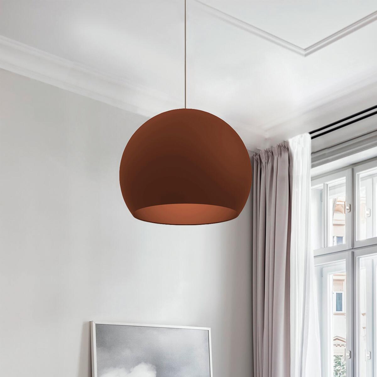 Sospensione in metallo caratterizzata da un design moderno che diffonde gradevolmente la luce. Verniciata in colore corten. Adatta a qualsiasi ambientazione moderna/classica. Disponibile nella versione con diametro 25 centimetri (1x E27), diametro 40 centimetri (1x E27) e diametro 50 centimetri (1x E27).. Ideale come luce diffusa per una stanza di dimensione 15-20 mq. Consigliato per zona giorno e zona notte. Prodotto 100% Made in Italy. Disponibilità ricambi garantita per 7 anni. Riparabilità garantita al 100% in ottemperanza ai principi di economia circolare