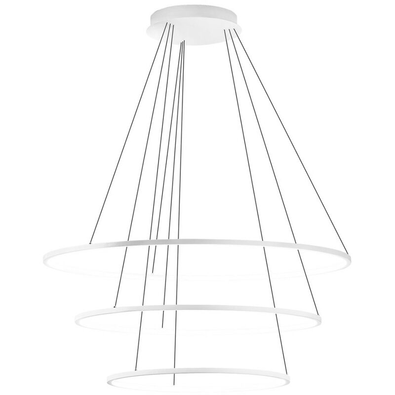 Lampadario moderno dalla forma originale e morbida che volteggia con leggerezza nella stanza. Una sospensione che crea movimento nel locale, anelli che possono essere posizionati in modo sfalsato o sullo stesso livello sia per esigenza per incrementare l'ampiezza del fascio di luce o sia per dare un semplice tocco di arredo all'ambiente. Per chi ama illuminare con un semplice design contemporaneo. Lampadario led Gea Luce ERIKA S3 B Sospensione 3 anelli, alluminio bianco, modulo led integrato, 3000°K TRE moduli led integrati, da 35W (anello piccolo), da 45W (anello medio) e 48W (anello grande), con tonalità della luce calda (3000°K). Base tonda, ancoraggio soffitto, di 30 cm per un'altezza di 4.5 cm e copribase di 33 cm. Diffusore in silicone bianco opale. Altezza regolabile dalla base con sistema autobloccante grip lock . Categoria lampadari moderni a led. Struttura in alluminio verniciato BIANCO OPACO. Lunghezza regolabile cavi elettrici massima 200 cm. Dimmerabile tramite dimmer