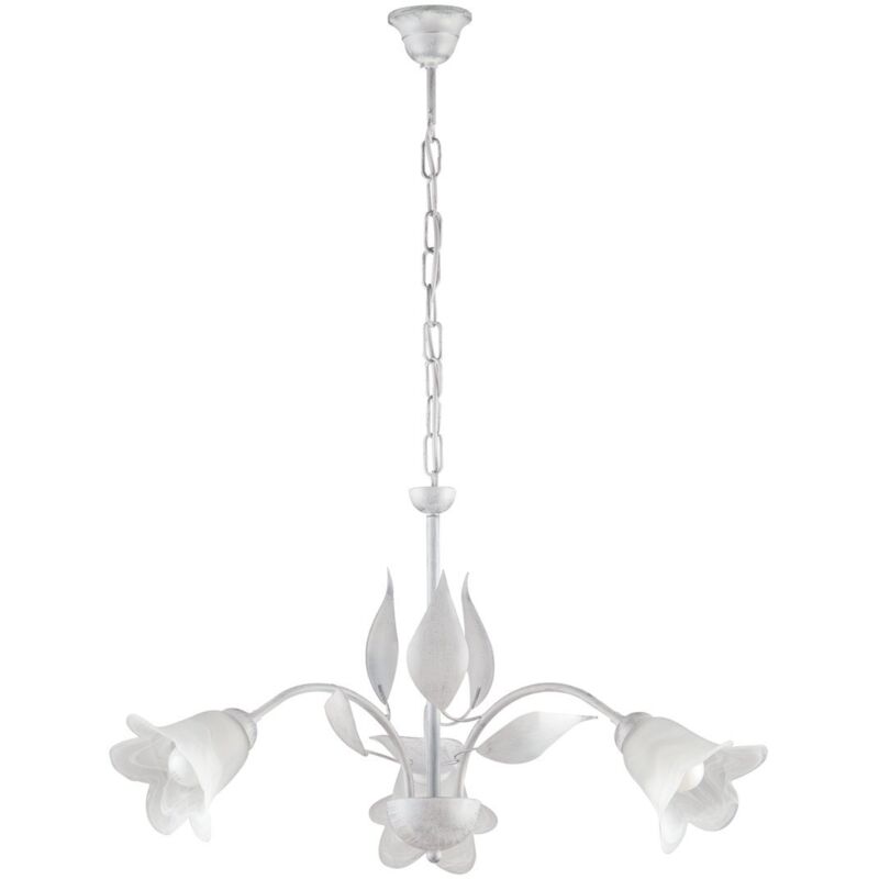 Collezione Olga LAMPADE FLOREALI IN STILE SHABBY CHIC Lampadario a sospensione a 3 luci in ferro laccato bianco con decorazione effetto antichizzato argento e diffusori in vetro centrifugato alabastro bianco. . E' possibile modificare l'altezza grazie alla catena regolabile, rendendo questo lampadario adattabile a tutti gli spazi. Grazie alle foglie in metallo forgiate a mano ed ai diffusori a fiore questo articolo delicato e grazioso, in perfetto stile shabby chic, adornerà con eleganza e raffinatezza ogni ambiente. Disponibile anche nella versione avorio e oro.