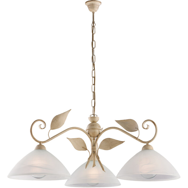 Lampadario in ferro laccato avorio con decorazione oro antico e diffusori in vetro diametro 30 alabastro bianchi 3 luci