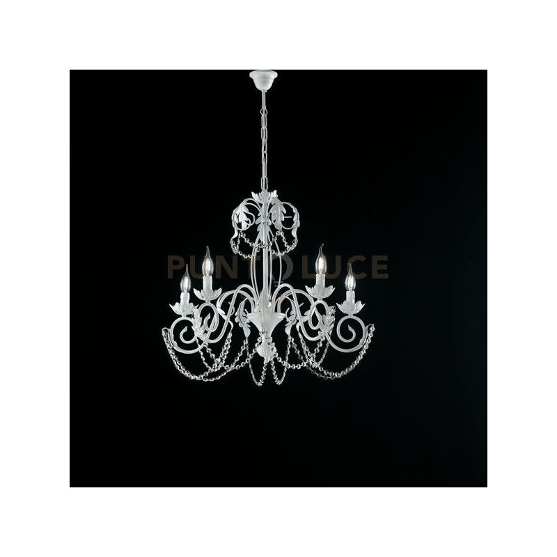 Lampadario in ferro laccato bianco con decorazione effetto shabby chic e strass in cristallo 5 luci