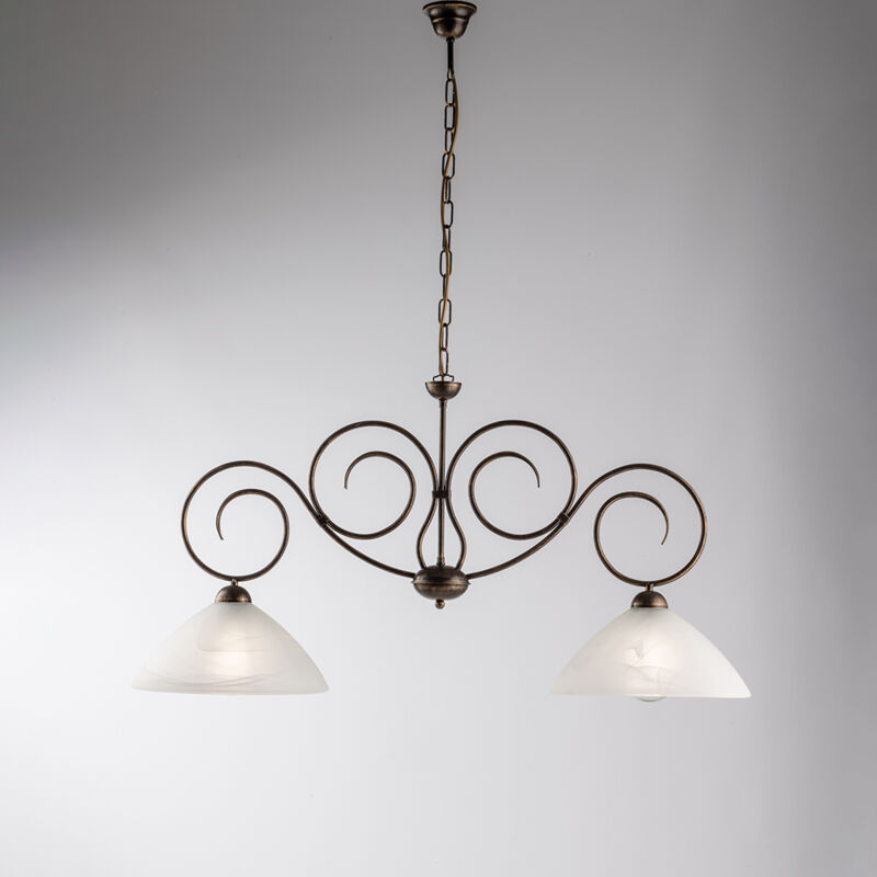 Collezione Milly UNA LINEA DALL'ANIMO AVVOLGENTE Bilanciere classico 2 luci in ferro battuto laccato color marrone con lavorazione oro chiaro. Ampi diffusori in vetro alabastro bianco dal bordo liscio completano questa sospensione con una montatura aggraziata grazie ai ghirigori in ferro lavorati manualmente da mastri artigiani italiani. Con catena utile per regolarne l'altezza. Disponibile anche nella versione bianco shabby.