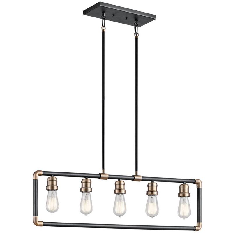 Collezione Imahn TUBATURA A VISTA Lampadario lineare a 5 luci. La collezione Imahn presenta caratteristiche industriali, sfruttando l'ispirazione delle tubature a vista e mescolando le finiture in ottone nero e naturale. Per accentuare ulteriormente lo stile minimalista, si consiglia una lampada a filamento LED stile Edison.