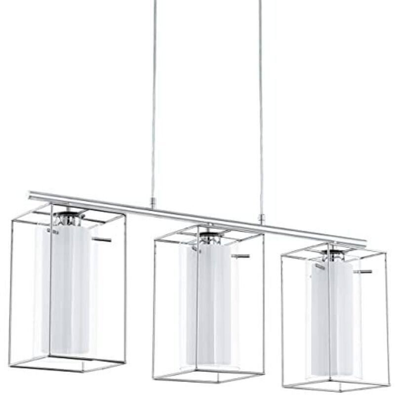 Collezione Loncino 1 LA LAMPADA CHE ESALTA LA BELLEZZA La lampada a sospensione LONCINO 1 è realizzata da un corpo in metallo color cromo pendente fissato a tre cornici in reticolato.. Il cilindro interno in vetro chiaro lascia intravedere il paralume bianco in vetro satinato che si trova all'interno del cilindro. Questa lampada a sospensione è ideale per interni moderni e offre un'illuminazione accogliente nel soggiorno o nella sala da pranzo, posizionata ad esempio al di sopra di un lungo tavolo da pranzo. Le lampadine non sono incluse nella consegna. Per la lampada è adatta qualsiasi lampadina con attacco E27.