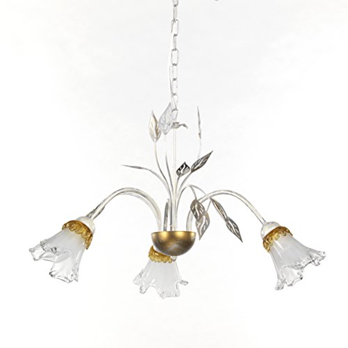 ONLI - Lampadario 3 luci Lancia in metallo bianco spennellato argento con sfumature dorate e calle in vetro. 3 x E14, metallo;