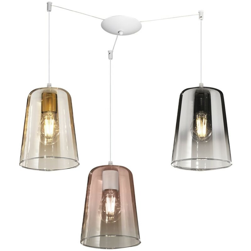 Sospensione tre luci di semplice design ma dall'effetto luminoso e colorato nella stanza. Un lampadario dalla doppia luminosità consigliato per penisole, tavoli da pranzo, scrivanie ... o da installare al centro di qualsiasi stanza. Illuminare e arredare con semplicità. Lampadario Top Light SHADED 1164BI S3 S MC Lampada soffitto con calate vetro pirex trasparente ambra, cromo, rame, E27 LED Base e particolari in metallo con finitura in BIANCO OPACO. Piccoli cilindri fissati al soffitto, tramite stopper, che permettono di portare la luce secondo le proprie necessità. Illuminazione diffusa. Diametro diffusori in vetro di 16 centimetri. La sospensione è provvista di tre portalampade E27 per lampadine a led escluse, da 18W. Le lampadine a led possono essere scelte di ben tre tonalità diverse a seconda dell'arredamento, di luce calda 2700-3000°K, di luce naturale 4000°K o di luce fredda 5000-6500°K. La temperatura di colore di 2700°K-3000°K indica una luce calda e accogliente, simile al