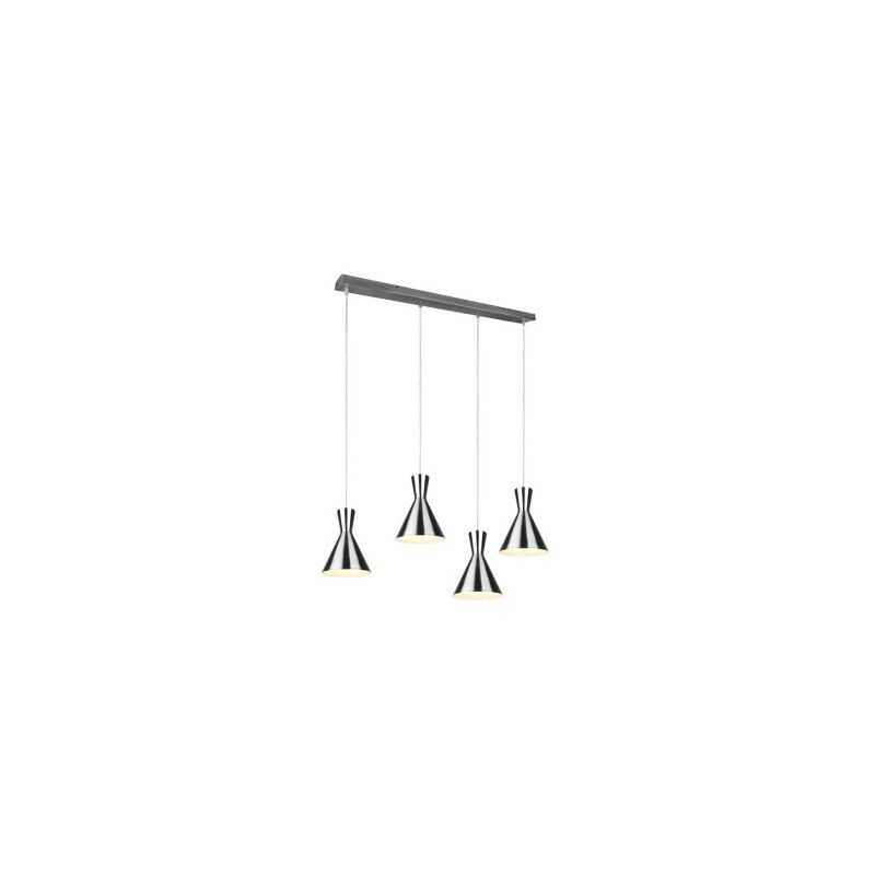 Il lampadario a sospensione ENZO di Trio Lighting è composta da una struttura lineare in metallo finitura nichel opaco. I 4 diffusori hanno una forma a doppio cono. Cavetti regolabili che consentono di regolare l'altezza dei punti luce in base i propri gusti ed esigenze. E' possibile installare 4 lampadine con attacco E27, max 28 watt, lampadine non incluse nella confezione. Grazie all'utilizzo di lampadine Led si otterrà una migliore resa luminosa e un basso consumo energetico. Un elemento semplice dal design moderno ed originale, ideale per diversi ambienti della vostra casa. Consigliato ad esempio per illuminare l'isola di una cucina, il tavolo di una sala da pranzo o ancora tavoli e banconi di locali commerciali come bar e ristoranti. Disponibili anche le versioni di colore nero o bianco.