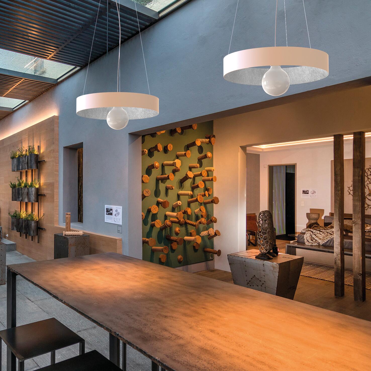Il prodotto di illuminazione Halo si adatta perfettamente a diversi utilizzi risultando efficace ed arredante in differenti spazi e nei più vari arredamenti. La sospensione è composta da un cerchio in metallo verniciato a polvere bianco esternamente e foglia argento applicata a mano internamente, un rosone, una montatura equipaggiata con attacco per lampadina E27, un cavo elettrico in PVC e tre cavi di sostegno in acciaio.. Lampada a sospensione realizzata interamente con prodotti ed elementi 100% Made in Italy. Imballaggi riciclabili al 100%, prodotti seguendo la gestione forestale responsabile e il riciclo della carta.. Tutte le componentistiche sono sostituibili in caso di danneggiamento in linea con la normativa eco design