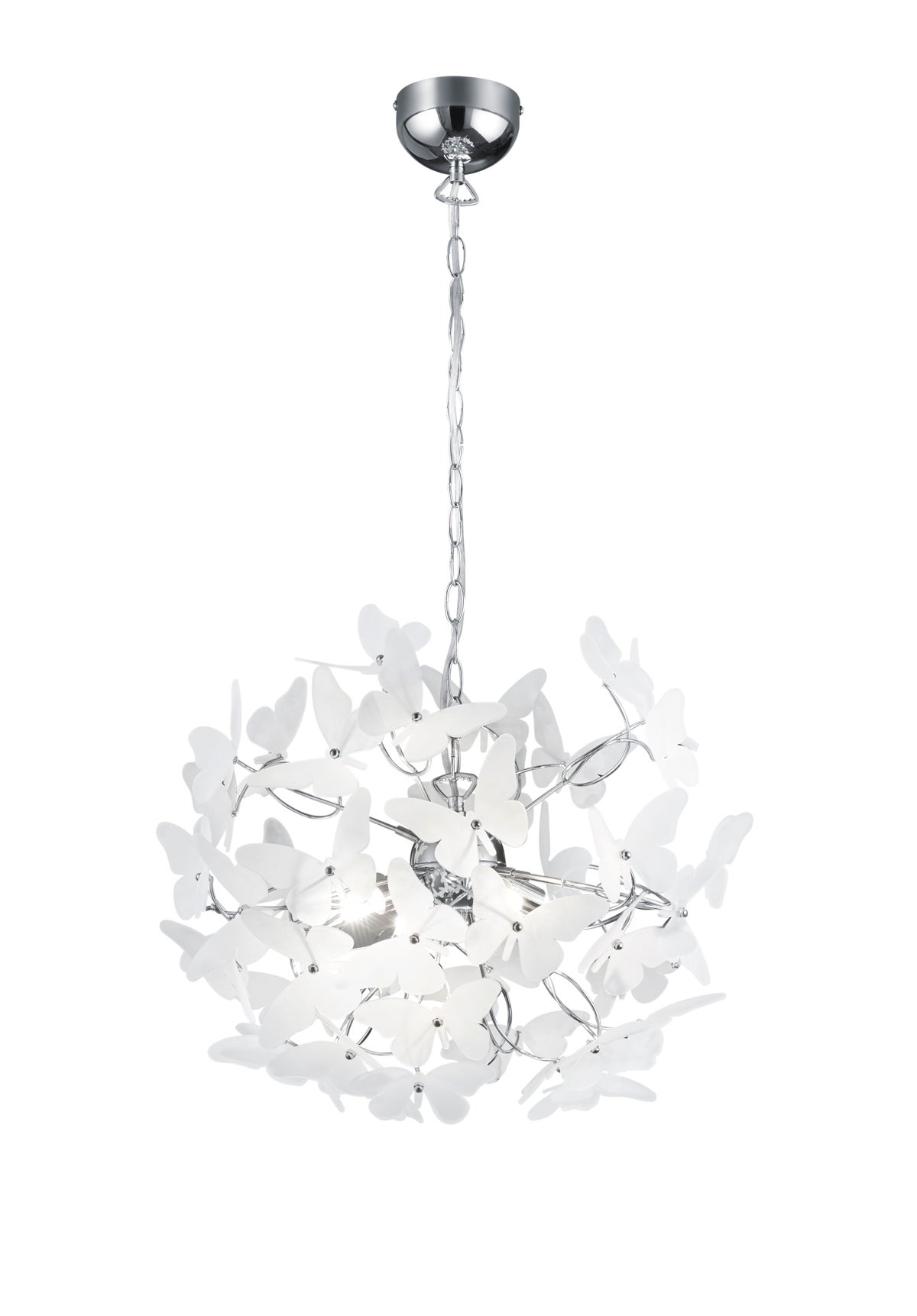 Sospensione cromata moderna, con kit applicazioni a forma di farfalla in colore bianco e multicolor diametro 50 cm con lampadine G incluse.Possibilità di applicazione farfalle decoro a piacere per versione tutta bianca o multicolor