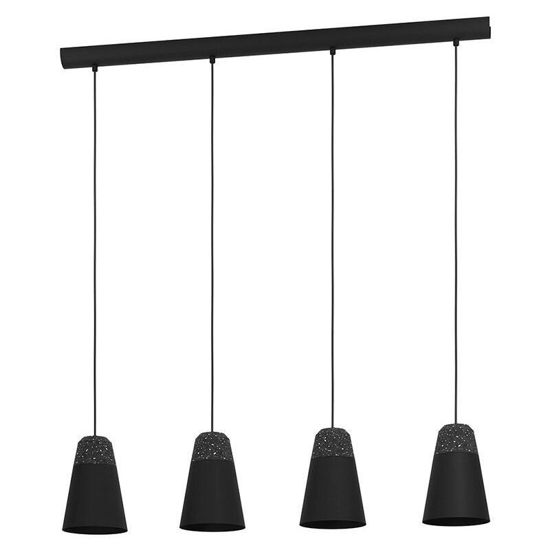 Collezione Canterras UN TOCCO DI CLASSE E COLORE La lampada a sospensione CANTERRAS è composta da quattro paralumi neri in metallo di forma conica.. Ciascuno dotato di un supporto grigio scuro-bianco in battuto di terrazzo alla veneziana, corredata di un pendente nero in metallo. Questo semplice lampadario in design nordico si armonizza elegantemente con arredi moderni offrendo un'illuminazione accogliente per ogni ambiente, che sia nel soggiorno o nella sala da pranzo, posizionato ad esempio al di sopra di un lungo tavolo da pranzo. Le lampadine non sono incluse nella consegna. Per la lampada è adatta qualsiasi lampadina con attacco E27.