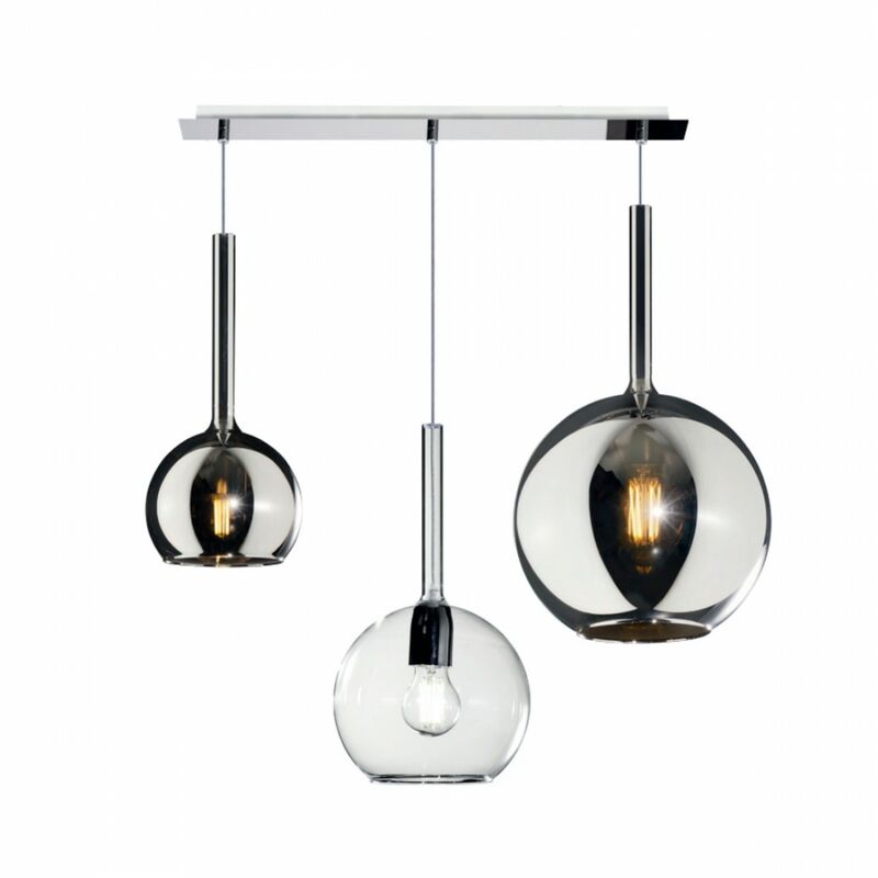 Barra a tre luci rifinita con semplici tre vetri soffiati colorati che illuminano uniformemente qualsiasi tipo di stanza. Una sospensione da regolare in altezza e creare un gioco sfalsato di calate che donano movimento all'ambiente. Un lampadario da installare su qualsiasi piano d'appoggio o al centro della stanza. Lampadario moderno Top Light FUTURE 1155CR S3 RMIX TC E27 LED Calata tripla, metallo cromo e vetro pirex colorato, diametro 15, 20 e 25cm, da interni Categoria: Lampade a sospensione. Lampade a sospensione composta da tre ampolle in vetro pirex soffiato di diametro diverso 15 - 20 - 25 centimetri, regolabile in altezza. La base rettangolare misura una lunghezza di 60 centimetri ed una larghezza di 4 centimetri. Struttura è in metallo CROMO ed i vetri sono di diverso colore uno TRASPARENTE e due CROMO (TC). L'articolo FUTURE può essere personalizzato scegliendo tra i molti colori disponibili sia delle strutture (CR cromo, OS ottone satinato o BI bianco), sia dei vetri (TR