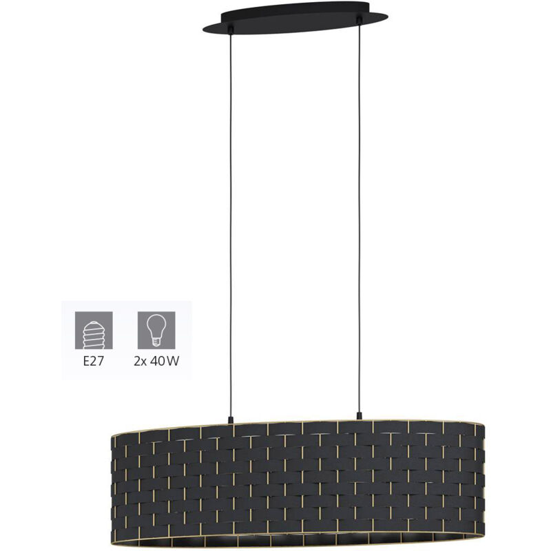 Collezione Marasales LA LAMPADA PER UN'AMBIENTE SEMPLICE E CONFORTEVOLE La lampada a sospensione MARASALES è composta da un paralume ovale in ottone spazzolato con fasce intrecciate di stoffa nera. Ha una larghezza di 78 cm.. Grazie al suo design anni '60, questa plafoniera si abbina a stili di arredamento scandinavo, moderno o retrò ed è ideale posizionato sopra al tavolo da pranzo. Le lampadine non sono incluse nella consegna. Per la lampada è adatta qualsiasi lampadina con attacco E27.