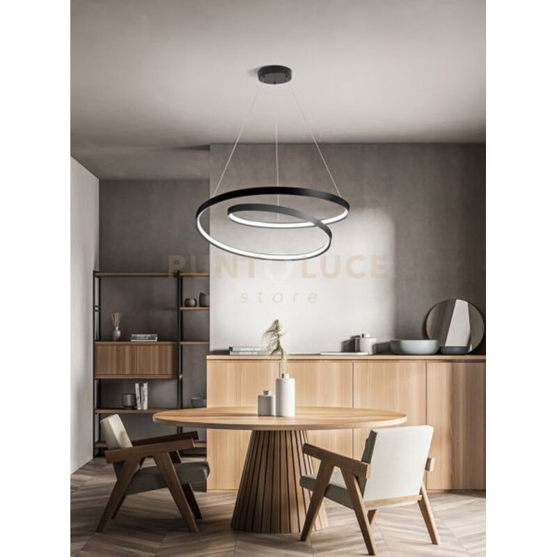 Collezione Ritmo LA LAMPADA CHE SEGUE IL TUO RITMO Sospensione elegante realizzata in metallo e alluminio verniciato di colore nero.. Il design moderno e minimalista di Ritmo si adatta perfettamente ad ogni tipo di arredamento, dallo stile più classico al più contemporaneo. Questo prodotto è ideale per essere utilizzato in soggiorni, camere da letto, corridoi o altre stanze della casa che richiedono un'illuminazione mirata ed efficace.