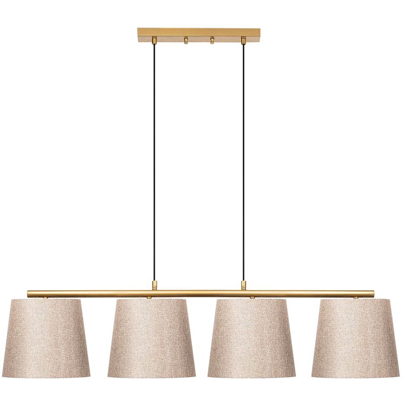 Lampada da soffitto Struttura in metallo Paralume Base in metallo Dimensioni: 148 x 25 cm Altezza totale: 48-125 cm Diametro del paralume: 20-25 cm Altezza paralume: 22 cm Dimensioni della base: 36 x 5 x 3 cm IP20 Tipo di filo: 4 x E27 Max 15 W Colore: oro brillante