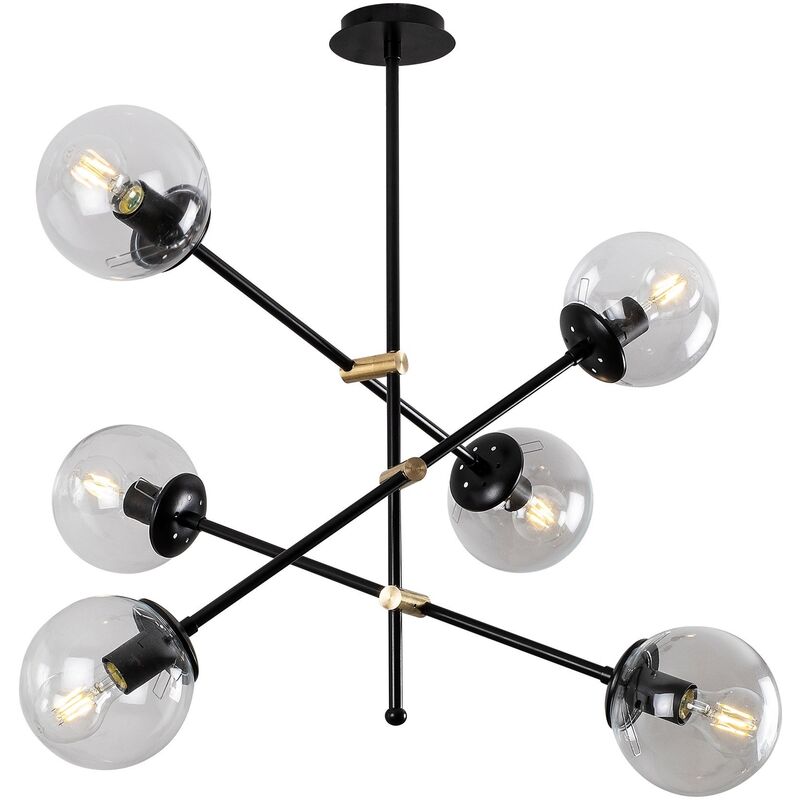 Lampada da soffitto Struttura in metallo Paralume in vetro Diametro: 82 cm Altezza: 76 cm Diametro paralume: 15 cm Altezza paralume: 15 cm Tipo di filettatura: 6 x E 27 Max 40 W IP20 Diametro della base: 10 cm Altezza base: 3 cm Colore: nero