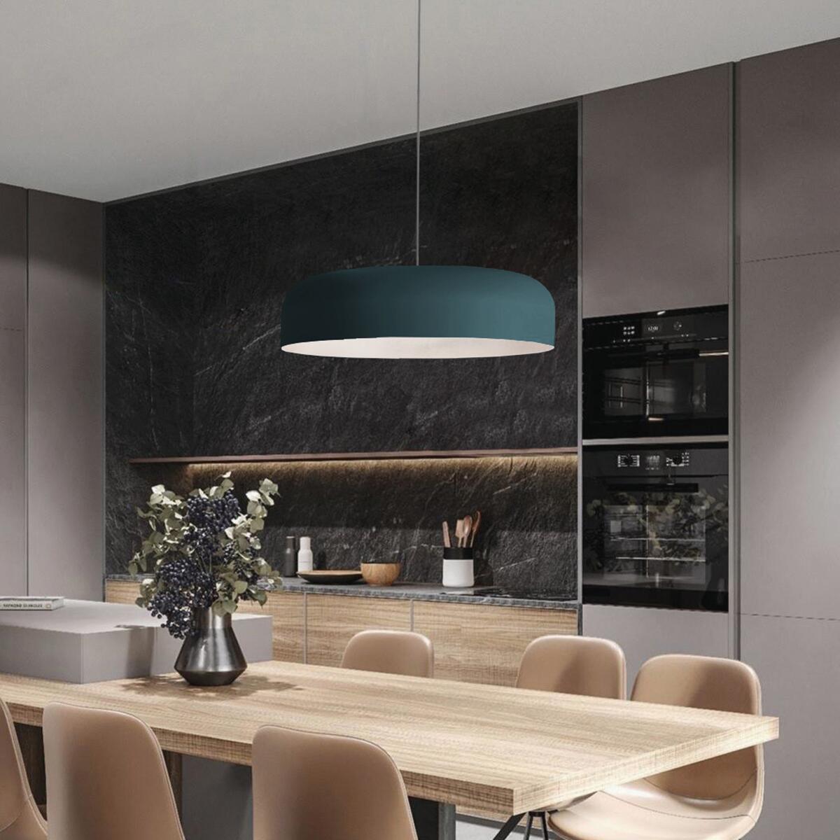 Sospensione in metallo caratterizzata da un design moderno che diffonde gradevolmente la luce. Verniciata in colore blu esternamente e bianco internamente. Adatta a qualsiasi ambientazione moderna/classica. Disponibile nella versione con diametro 40 centimetri (1xE27).. Ideale come luce diffusa per una stanza di dimensione 15-20 mq. Consigliato per zona giorno e zona notte. Prodotto 100% Made in Italy. Disponibilità ricambi garantita per 7 anni. Riparabilità garantita al 100% in ottemperanza ai principi di economia circolare