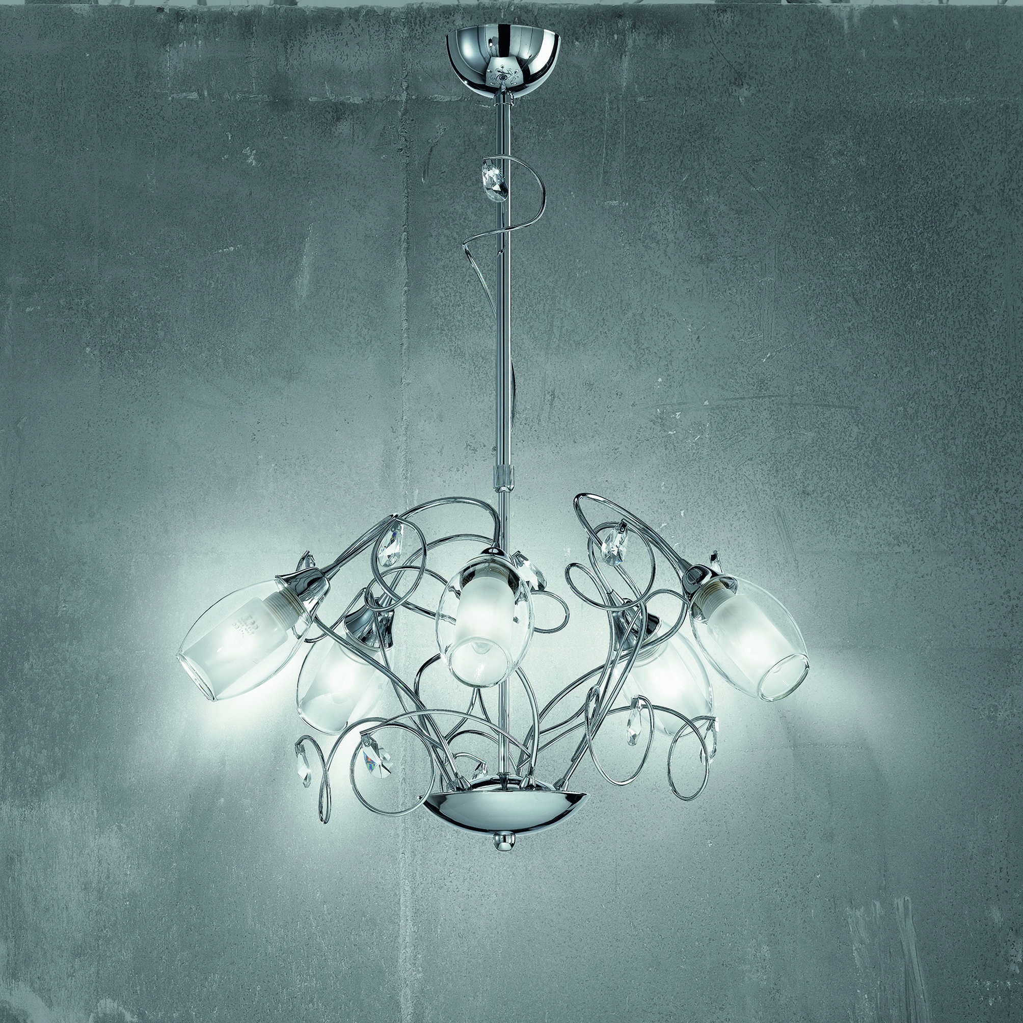 Il lampadario Ely crea un'atmosfera piacevole e confortevole e presenta uno stile neoclassico, ricercato e molto raffinato. Delicato e contemporaneo, questo prodotto in metallo a 5 luci color cromato si abbina perfettamente con gli arredi neoclassici. Lo stile neoclassico e i colori di questo modello sono esaltati dalla finitura cromata. Sarà perfetto per illuminare le tue stanze conferendo un'atmosfera retrò e un fascino unico ai tuoi interni. Per far funzionare questo lampadario, è indispensabile l'acquisto di 5 lampadine E14 da massimo 28W.