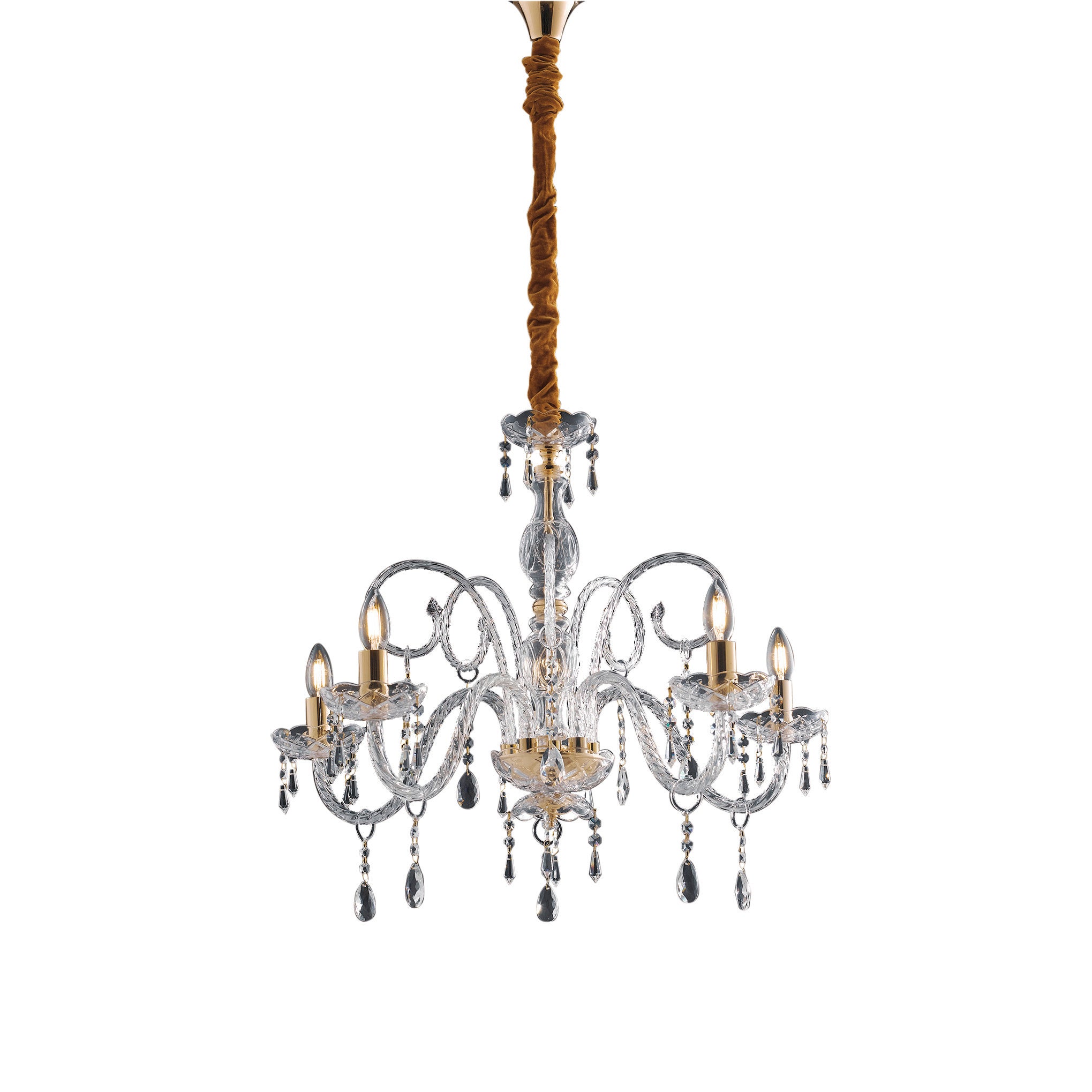 Unico nel suo genere, il lampadario Monalisa sarà capace di sposarsi a ogni universo decorativo apportando un look neoclassico sofisticato e raffinato. A 5 punti di luce, questo modello in vetro saprà valorizzare alla perfezione gli interni con il suo colore dorato. Elegante, i toni e l'effetto cromato di questo lampadario lo rendono perfettamente neoclassico. Sarà perfetto per illuminare le tue stanze conferendo un'atmosfera retrò e un fascino unico ai tuoi interni. Per far funzionare questo lampadario, è fondamentale l'utilizzo di 5 lampadine E14 da massimo 28W.