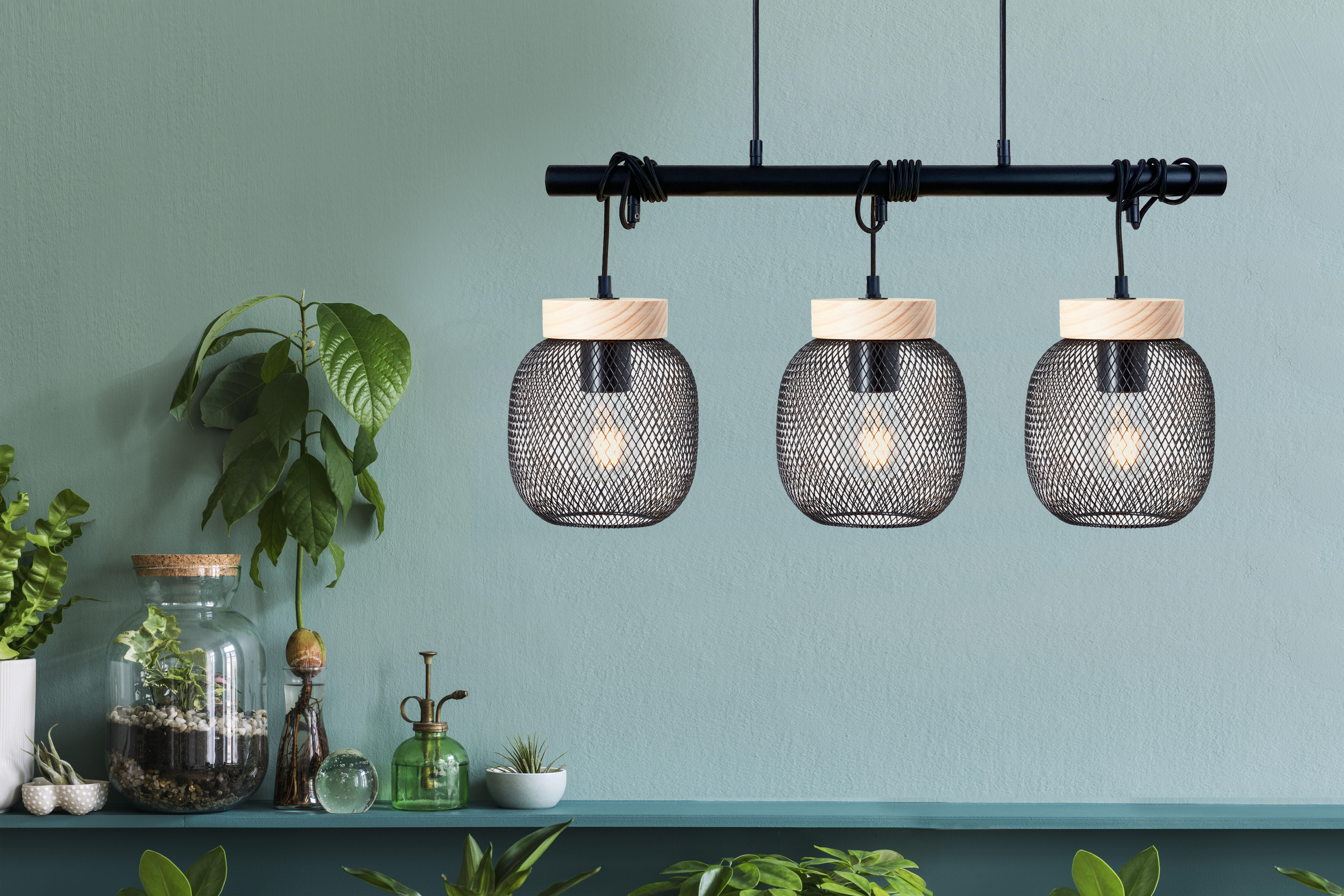Sospensione Giada a tre luci in metallo e legno, color nero. L'altezza è regolabile e dispone di un attacco E27. Si può coordinare ad altri articoli di queste serie.