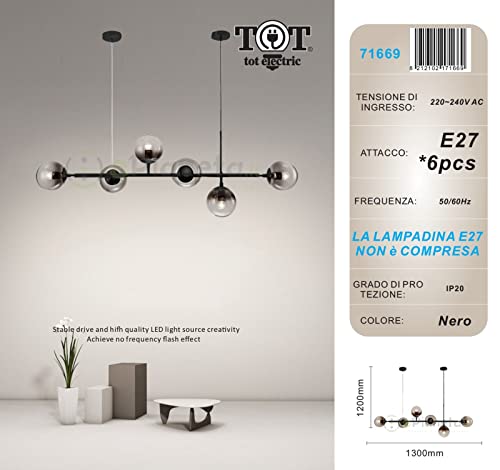 Caratteristiche: Attacco E27(lampadine non incluse) - Numero di attacchi 6 - Tensione di ingresso AC 220-240V - Colori disponibili Oro spazzolato - Argento - Nero - Uso Interno -Tipo di materiale Metallo / Vetro - Dimensioni - Altezza1200 mm(cavo regolabile) - Larghezza1300 mm