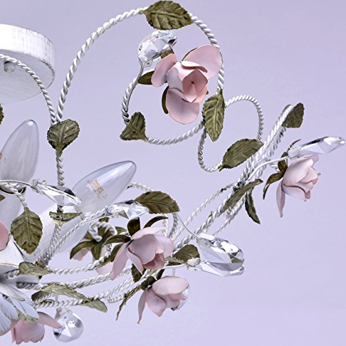 Struttura in metallo colore bianco con oro. Fiori in ferro battuto colore rosa e verde. Gocce di cristallo.