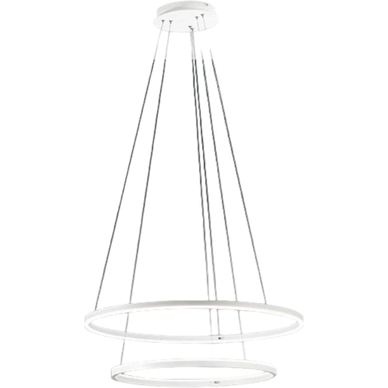 Lampadario a sospensione a led Giotto moderna, rotonda, in metallo bianco e diffusore in metacrilato ed una potenza di 65Watt. Lampadario a led a sospensione di design composto da due anelli molto luminosi. Lampadario a led moderno dimmerabile, questa plafoniera ha la possibilità di variare l'intensità della luce con un dimmer non incluso. Disponibile la dimmerazione con sistema bluetooth. Dimensioni del lampadario, anello grande ø80cm, anello piccolo ø60cm, altezza regolabile fino a 200cm. Ideale da installare nelle abitazioni moderne in stanze come salotti, cucine, camere da letto, corridoi o bagni. Lampadario a led con un design moderno molto apprezzata da interior designer, architetti e progettisti, è molto luminosa. Lampadario a led a sospensione perfetto per arredare studi professionali, uffici, negozi o showroom. La lampada di colore bianco si adatta in tutti gli ambienti. Su richiesta, e un'aggiunta di prezzo, è possibile avere il lampadario a led Giotto regolabile con un