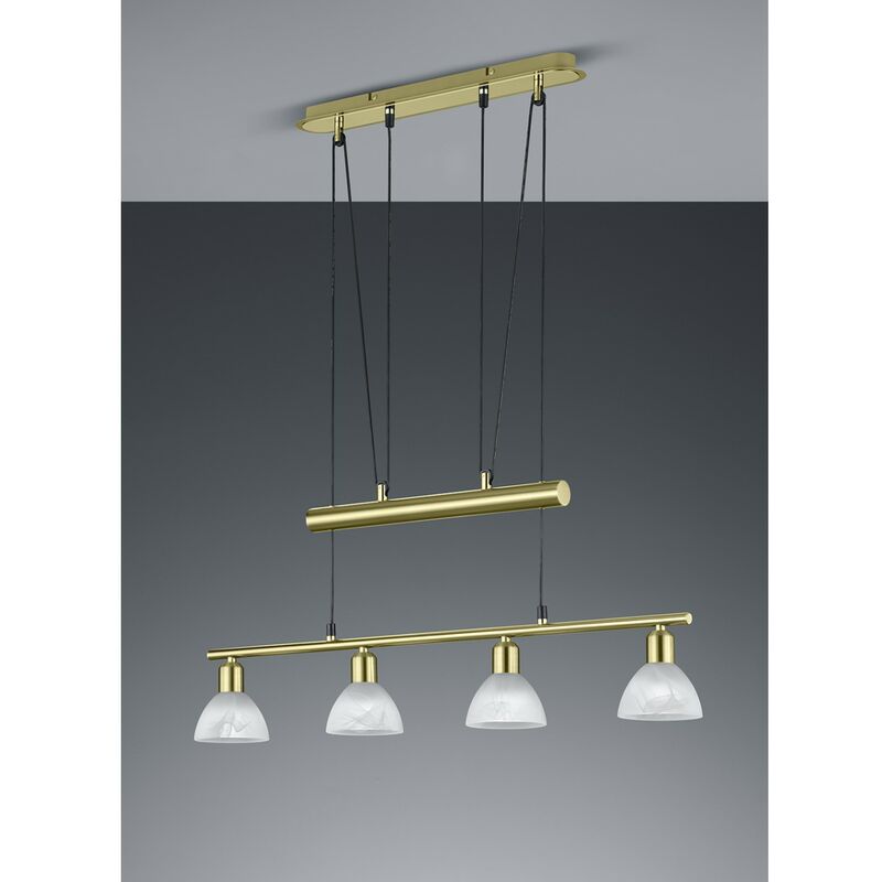 Lampadario Sospensione Ottone 4 Paralume Vetro Levisto La lampada a sospensione LEVISTO di Trio Lighting presenta un profilo in metallo di colore ottone satinato e 4 paralumi in vetro color alabastro, rivolti verso il basso. Cavetti regolabili in lunghezza grazie al sistema sali e scendi e al contrappeso che facilita la regolazione dell'altezza. Dotata di 4 lampadine E14 LED da 5 watt, 470 lumen, 3000k luce calda, incluse. Una volta guaste le lampadine sono facilmente sostituibili. Un elemento dal design moderno che si adatta bene a tutti gli ambienti privati residenziali o anche pubblici come locali commerciali ricettivi. Perfetta per illuminare in maniera ampiamente diffusa verso il basso, da collocare ad esempio sopra il tavolo della sala da pranzo, la penisola della cucina o anche tavoli e banconi di bar e ristoranti. Disponibile anche la versione di colore nichel opaco e altri articoli correlati della stessa serie. Caratteristiche: Profilo in metallo di colore ottone satinato 4