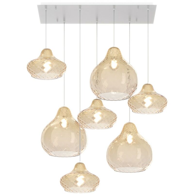 Lampadario sette luci realizzata con originali vetri soffiati, una lavorazione intrecciata che dona alla sospensione importanza e senso di maestosità. Una lampada da soffitto adatta sicuramente per un arredamento dalle tonalità calde e accoglienti, come per il soggiorno, la camera matrimoniale, ingresso o altra stanza dove la luce diventa l'unica protagonista di tutto l'ambiente. Lampadario vetro colorato Top Light DRESS 1191 BI S7 RMIX AMBRA Lampada soffitto, vetri colorati ambra, E27 LED La finitura del metallo è BIANCO opaco. A richiesta la struttura è disponibile in cromo lucido oppure in ottone spazzolato. Drop 1191 BI S7 RMIX AMBRA è una lampada soffitto realizzata con vetri soffiati colorati. Altezza regolabile. Categoria: Lampadari moderni-classici - Plafoniere moderne-classiche. Emissione di luce DIFFUSA. Colore vetri: AMBRA. Il lampadario è composto da sette vetri di cui tre della misura di 31 cm e quattro della misura di 25 cm. La lampada da soffitto è provvista di SETTE
