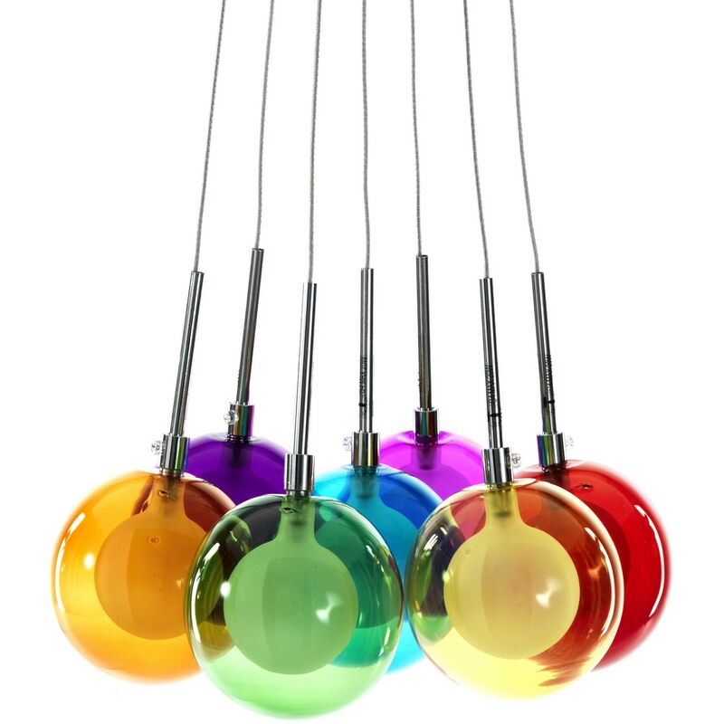 Lampadario 7 luci RAINBOW COLORS • sfere esterna realizzate in vetro colorato cm Ø10 • sfera interna realizzata in vetro smerigliato cm Ø6 • lampadario cm. H110 Ø32 • predisposto per nr.7 lampadine G4 max 20W (non in dotazione)