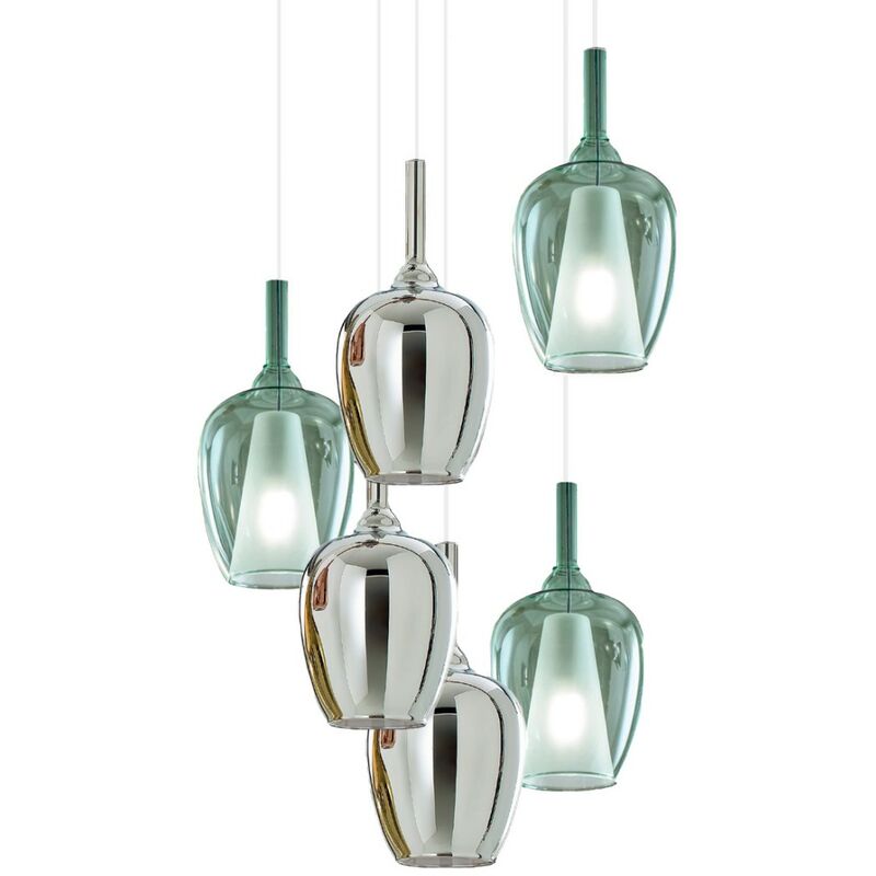 Sospensione sei luci che crea un originale grappolo di luce che crea una stupefacente atmosfera. Un prefetto connubio fra luce e design, ideale per abitazioni private o luoghi pubblici. Altezze regolabili e personalizzabili che creano movimento nelle stanza. Tante piccole calate capaci di creare un grande effetto. Un'illuminazione diretta più verso il basso e meno diffusa nella stanza, dovuta proprio alla colorazione del vetro. Lampadario vetro verde cromo Gea Luce OFELIA S10 Lampada soffitto, vetro cromo specchiato e verde trasparente, attacco E27 LED COMPOSIZIONE: N. 3 - OFELIA S10 - CR N. 3 - OFELIA S11 - VE N. 1 - ALICE BT-6 - NE I vetri misurano un diametro di 20cm, un diametro della bocca inferiore di 12cm e un altezza del vetro di 40.2cm. Base al soffitto diametro 50cm per un altezza di 3cm. Copribase piattello diametro 52cm. Altezza cavo elettrico 300 cm, regolabile. Filo elettrico trasparente. Finitura base NERO OAPCO . Il lampadario Ofelia S10 è provvisto di 6 portalampade