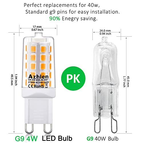 Lampade LED G9 LED 4W, Azhien Lampade LED Bianche Calde da 2700K, AC 200-240V, Senza Flicker, Senza Luce, Luminoso, Angolo di 360 Gradi, 450Lm, CRI> 82, Lampadina a LED G9, Confezione da 5