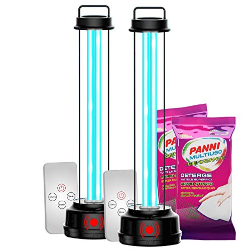 2x Lampade Doppia Tecnologia Raggi UV-C Ozono 38W Telecomando incluso Sensore Radar Movimento Germicida Sanificazione Ambienti da Batteri Acari Virus + 40 panni Igienizzanti superifici in Omaggio