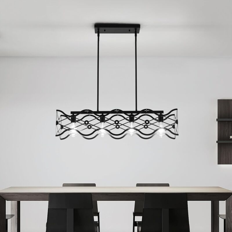 Dimensioni lampada a sospensione - - Lunghezza: 90 cm / 35,4 pollici, Larghezza: 22,5 cm / 8,8 pollici, Altezza: 20 cm / 7,8 pollici. Diametro del baldacchino del soffitto: 36 * 12 * 2,5 cm. Regolazione dell'altezza tramite pali: 43 - 155 cm (3 * 30 cm e 1 * 15 cm). [ Usa lampadine E27 ] - Richiede 4 lampadine E27 base Max. 60 W (NON incluse), può utilizzare lampadine a incandescenza, lampadine a LED, lampadine alogene, lampadine Edison, ecc. Il robusto paralume in metallo proteggerà la lampadina senza bloccare le luci. [ Stile industriale e moderno ] - Aspetto metallico e visione di design aperta per il tuo spazio per portare più divertimento. Semplice aerodinamica rende la lampadina più attraente senza attenuare la luce in un angolo piuttosto buio. [ Ambito di applicazione ] - La lampada di design geometrico penderà dal soffitto interno per fornire illuminazione. ( Compreso soffitto spiovente ) Adatto per sala da pranzo, isola cucina, soggiorno, salotto, sala di ricevimento