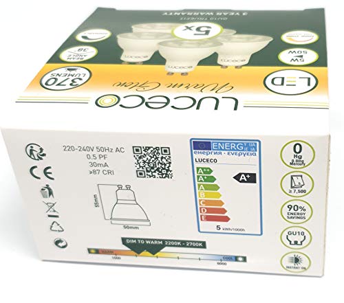 Confezione da 5 lampadine GU10 5 W di o per lampade alogene da 50 W, 370 lumen, bianco caldo, DIM2WARM, queste lampade GU10 possono essere utilizzate per interruttori della luce e interruttore dimmer LED Trailing Edge
