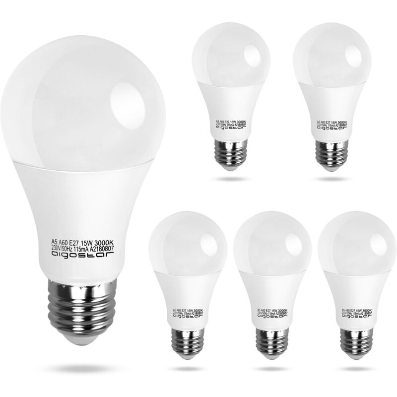 Set di 2x Lampadina LED E27 15W, bianco caldo - Serie A5 | Aigostar La serie di lampadine LED Aigostar - A5 garantisce prestazioni eccellenti: materiali e chip LED di alta qualità, per garantire una luce uniforme, liscia e priva di abbagliamento. Classe di efficienza energetica: A+ Specifiche Colore: Bianco Forma lampadina: A60 Attacco: E27 Potenza: 15W Potenza equivalente a incandescenza: 83W Voltaggio: 230V Corrente: 110mA Frequenza: 50Hz Vita media: 25.000 h Ciclo di commutazione (numero cicli accensione/spegnimento): 12.500 Flusso luminoso: 1200 lm Indice di resa cromatica RA: ≥ 80 PF: >0.5 Colore della luce: Bianco caldo Temperatura di colore: 3000K Fascio luminoso: ampio, 280° Protezione IP: IP20 Classe di efficienza energetica: A+ Dimensioni:D60*H119mm