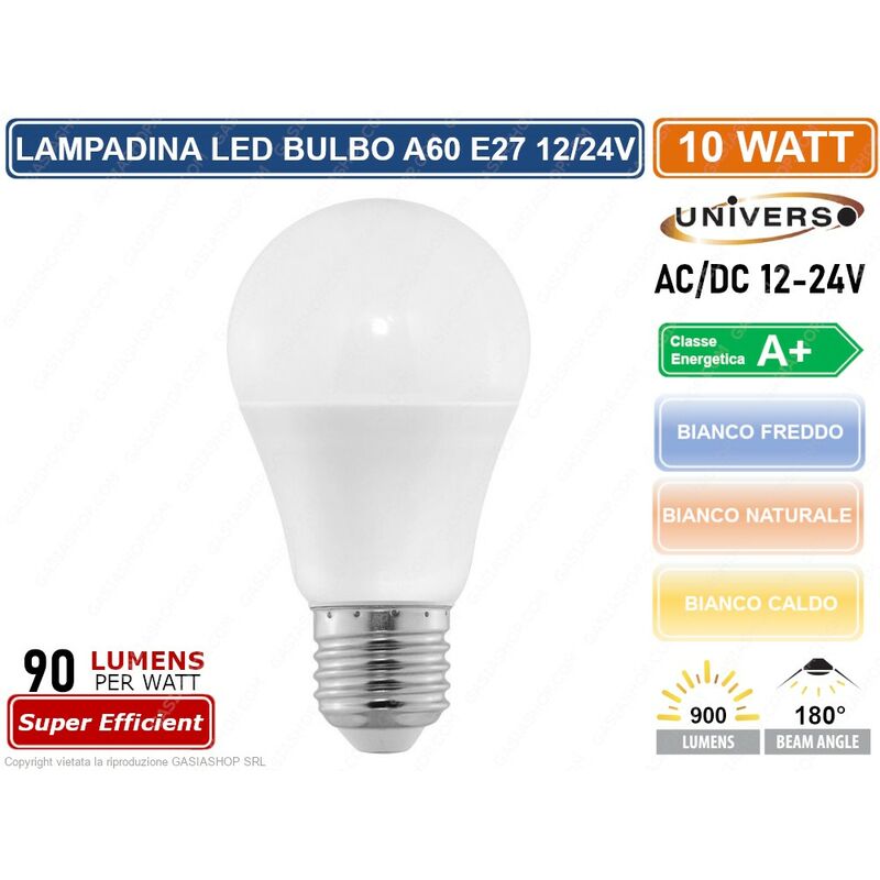 Lampadina LED con potenza di 10W e attacco E27. Forma Bulb A60 in materiale termoplastico bianco e alluminio. Fascio luminoso di 180° e flusso luminoso di 900 lm. Questa lampadina, ha un rapporto di 90 lm/W. Alimentazione AC/DC 12V 24V Questo modello di lampadina è disponibile con 3 diverse temperature colore: Luce Bianca Calda 3000K (A60-DC-C), Bianca Naturale 4000K (A60-DC-N) e Bianca Fredda 6500K (A60-DC-F). Dimensioni: Ø 60 x 120 mm.