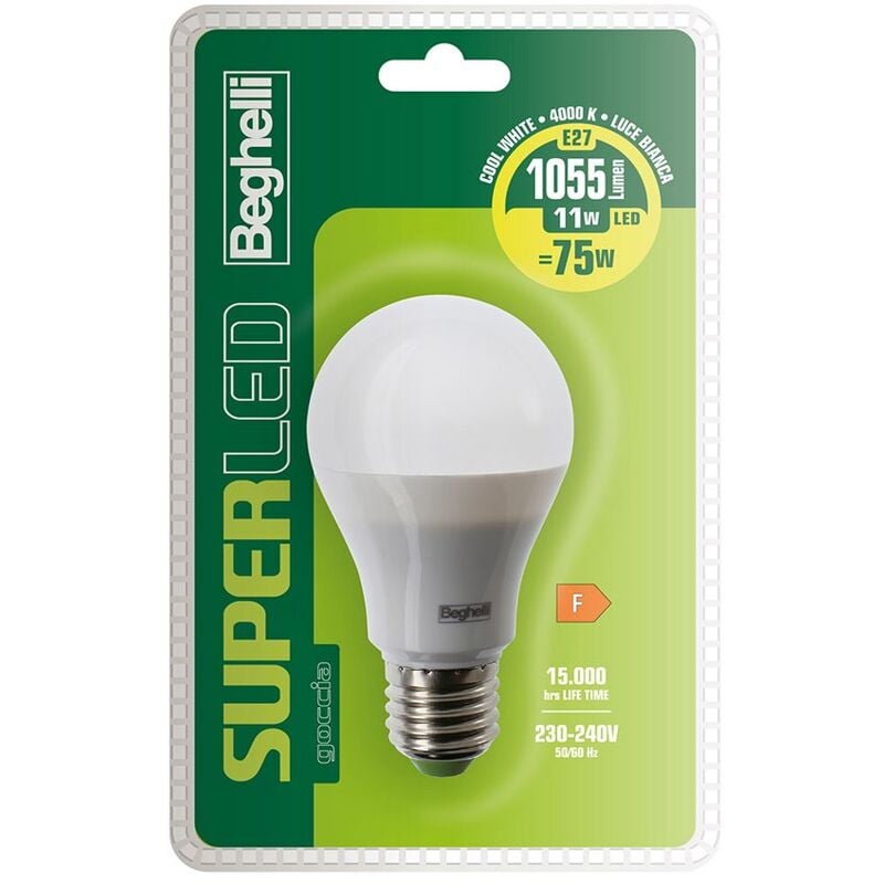 Lampadina Beghelli 11 W, 1055 lumen, attacco E27, colore K 4000, dim.d65x124mm. Lampadina Beghelli 11 W, 1055 lumen, attacco E27, colore K 4000, dim.d65x124mm. Le lampade Super LED Beghelli hanno una buona efficienza e con flussi fino 1500 lumen sono la soluzione economica per ogni installazione standard. Angolo fascio 270° - RA: 80 Avvertenza: lampadina LED non dimmerabile, non utilizzare con variatori di luce.