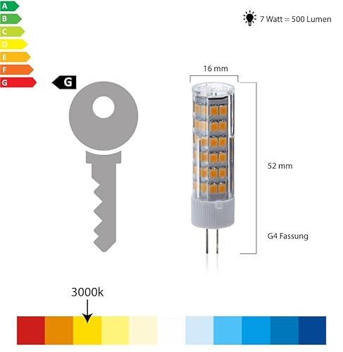 Confezione da 5 lampadine LED G4 da 7 Watt, luce bianca calda, 500 lm, non dimmerabili, AC 220 V-240 V, dimensioni: ca. ø 16 x 52 mm tecnologia chip SMD, corpo in ceramica